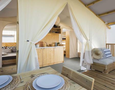 Køkkenet er udstyret med tekøkken og vask, elektrisk kaffemaskine og moccakande, mikroovn, køleskab og fryser, bord og stole. På verandaen er der et bord med stole til udendørs spisning og to liggestole.