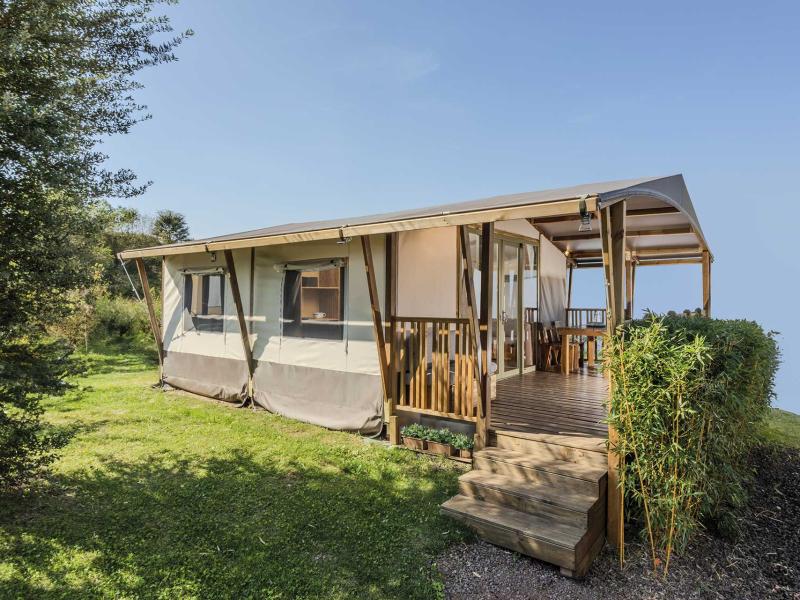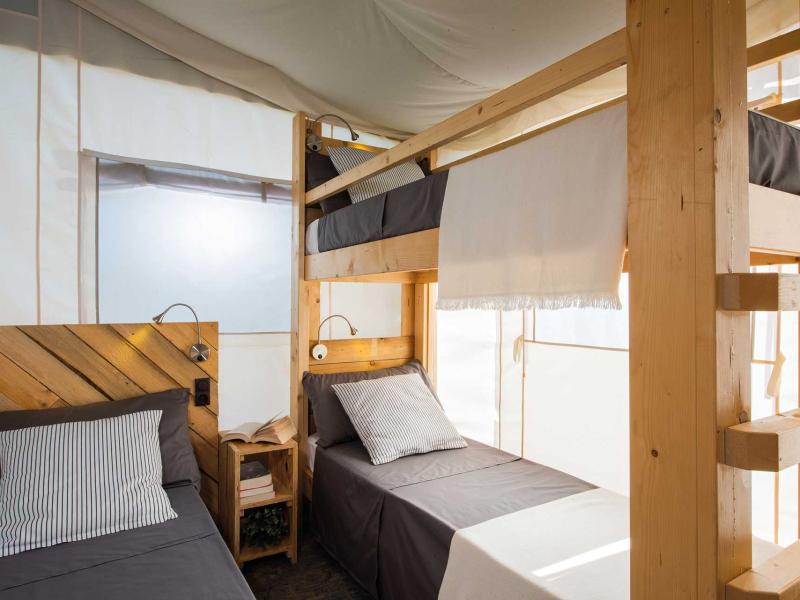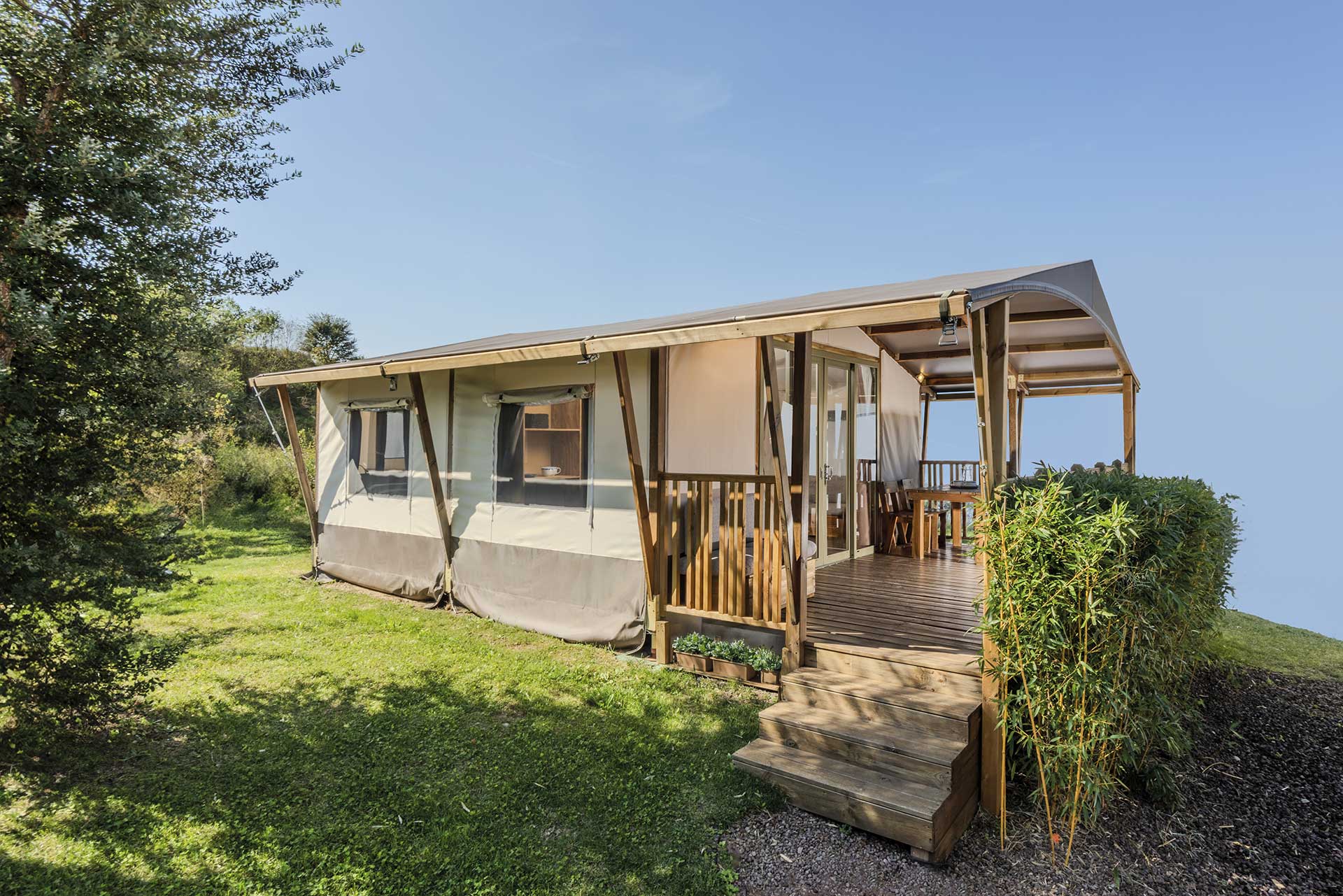 En mellemting mellem en mobilehome og et telt. Praktisk, men også meget naturlig med et trægulv, der er løftet lidt over jordhøjde, så der ikke er problemer i tilfælde af regn. Plads til 5 personer.