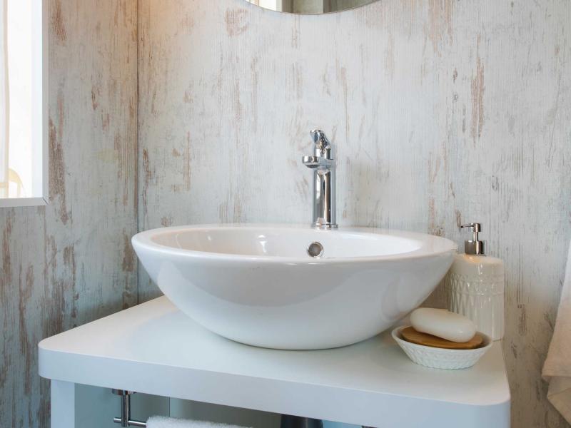 Der er et soveværelse med dobbeltseng og et værelse med enkeltseng og køjeseng, en stue med tekøkken, bord og stole, samt et komplet badeværelse med bruser, toilet og håndvask. Udenfor er der en overdækket træveranda.